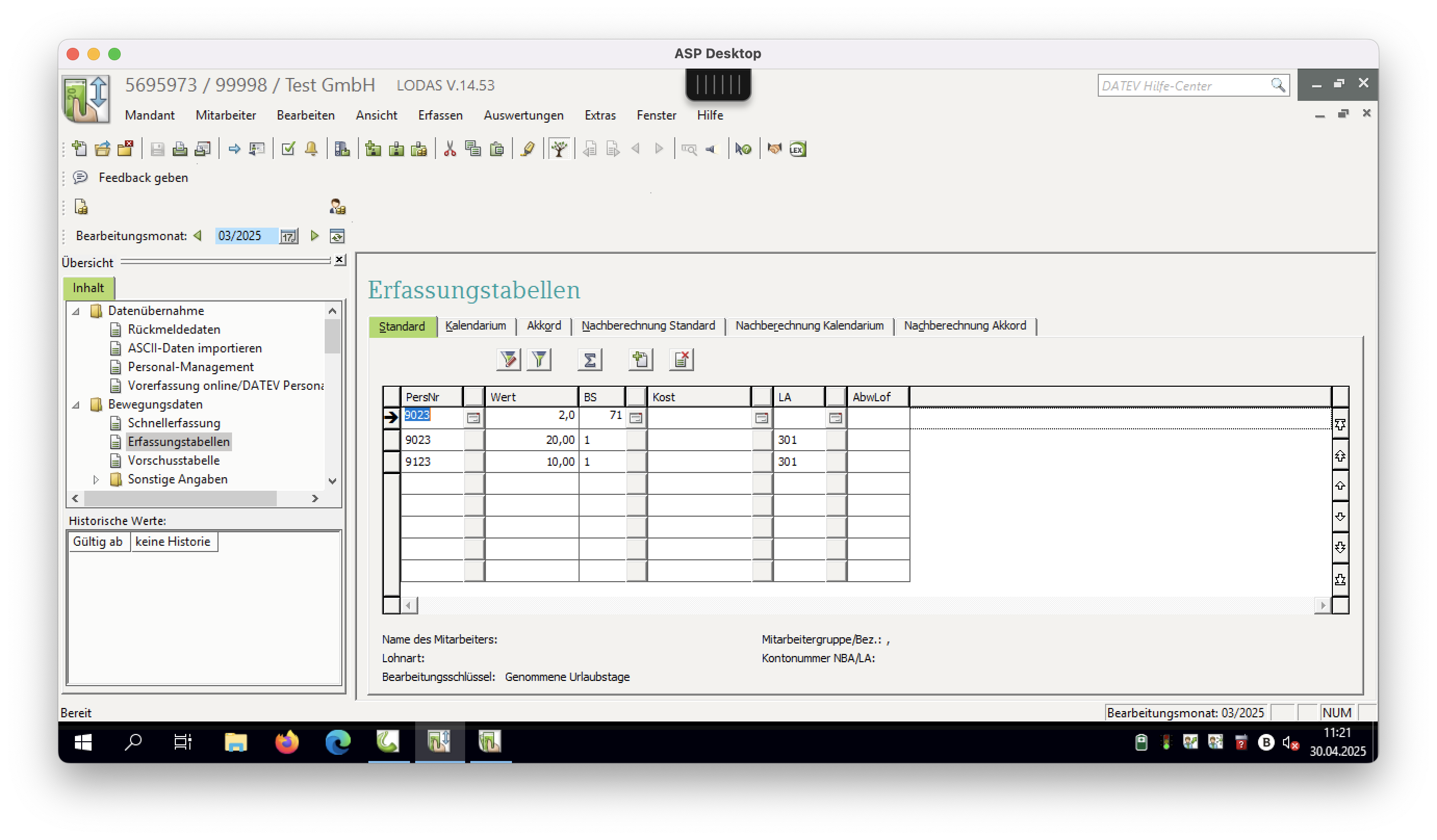 - Nach dem Import findest Du den Bewegungsdatensatz unter Bewegungsdaten -> Erfassungstabellen im Reiter Standard und die Fehlzeiten unter Personaldaten -> Beschäftigung im Reiter Fehlzeiten
